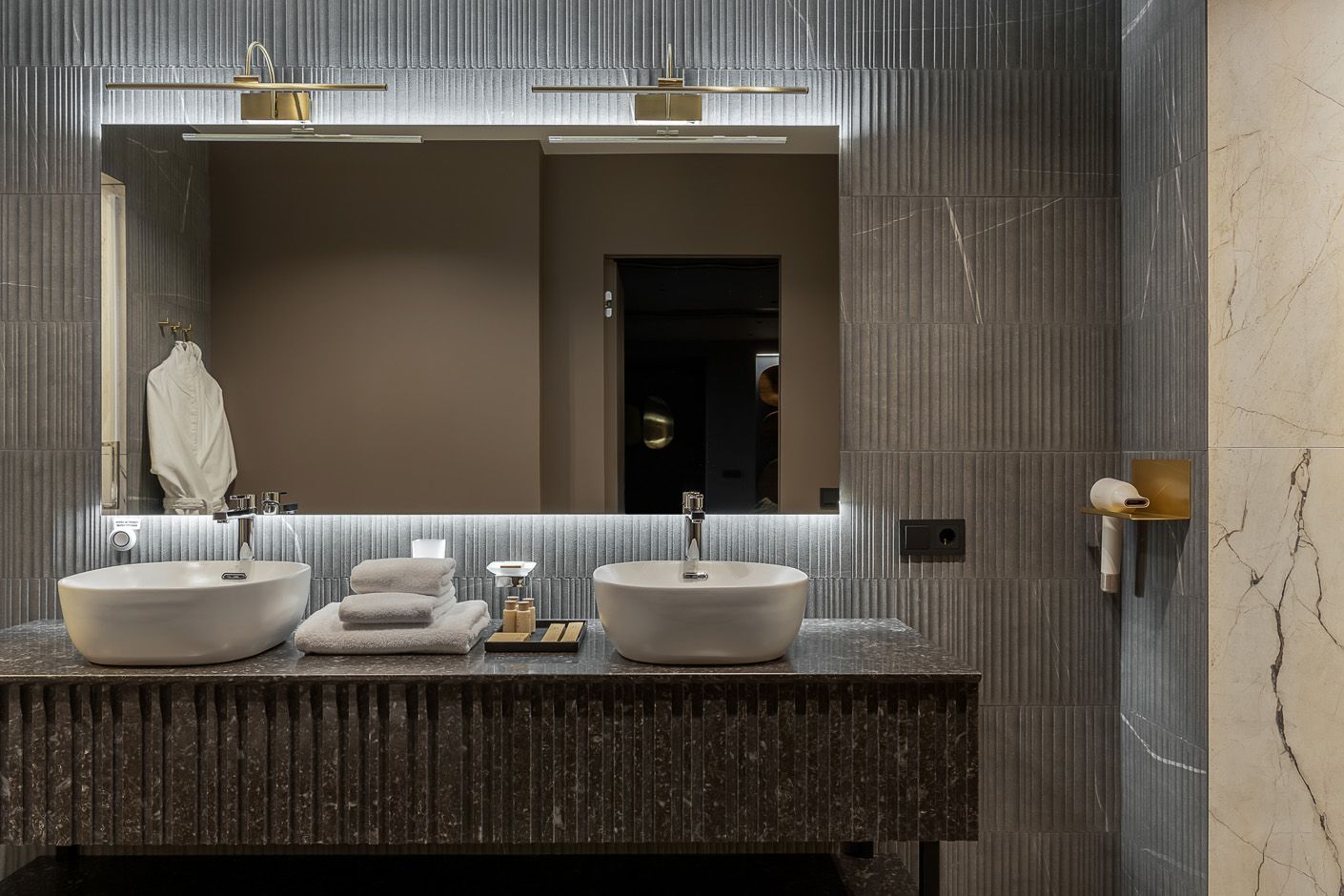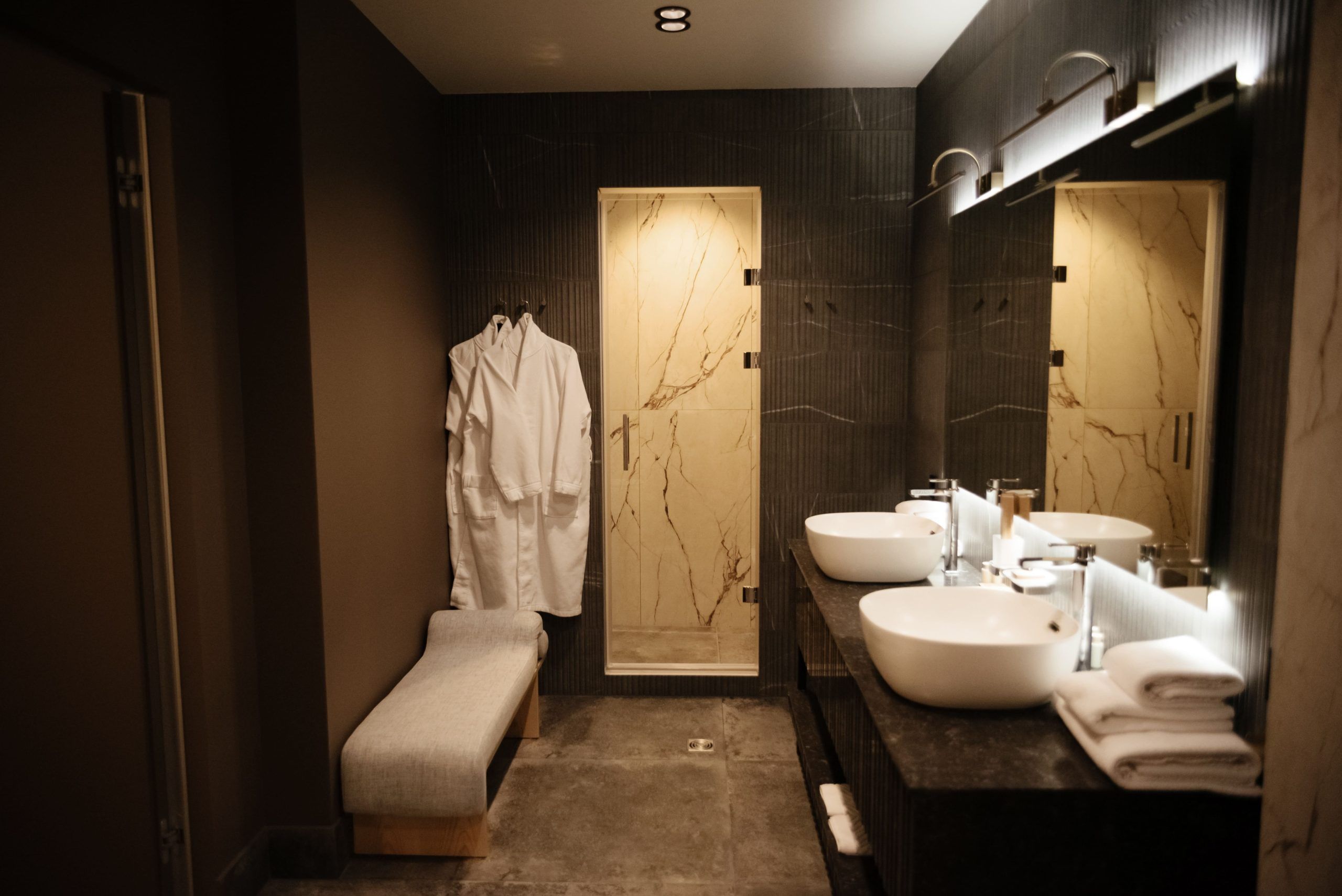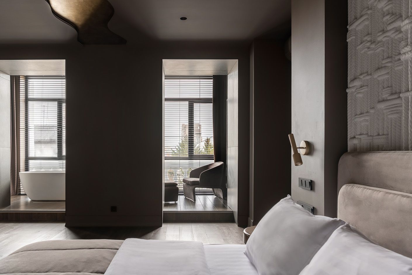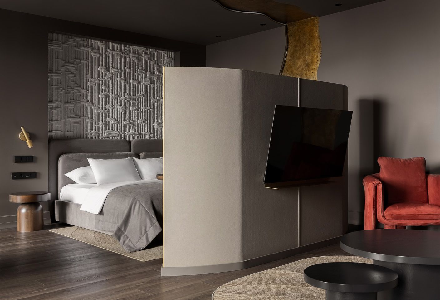 Искусно созданные световые эффекты окрашивают комнату в теплые тона и создают иллюзию погружения в заходящее солнце, отражающееся в водах реки Амур.
